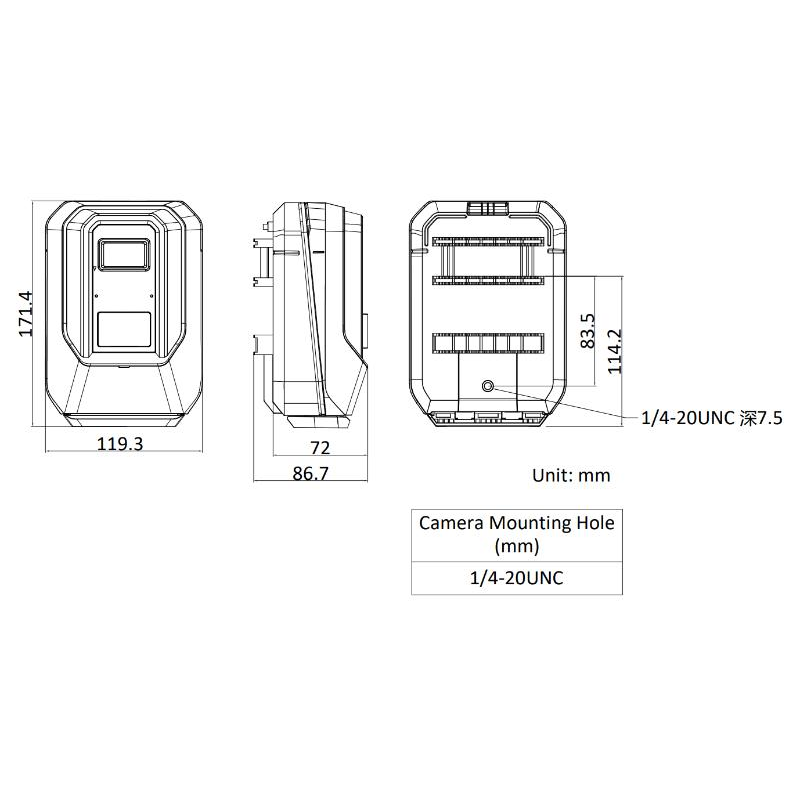 DS-2XS6C85F-IW ?低暪I(yè)級800萬動物保護(hù)專用攝像機(jī) 功能特性: 安裝調(diào)試:支持通過云帆app進(jìn)行快速配參、實(shí)時預(yù)覽、影像及狀態(tài)查閱 對接協(xié)議:支持ISUP5.0、螢石協(xié)議接入 續(xù)航能力:抓圖數(shù)量≥5000張 或者 工作時間≥3個月(取先滿足者) 高可靠性:符合IP67防塵防水設(shè)計(jì) 高靈敏度被動紅外(PIR)探測器,準(zhǔn)確檢測動物,實(shí)現(xiàn)高清圖像采集和短視頻錄制 接口功能:內(nèi)置麥克風(fēng)高清拾音,支持256 GB MicroSD/MicroSDHC/MicroSDXC卡本地存儲 采用工業(yè)級800萬傳感器,物理分辨率3840 × 2160,增強(qiáng)夜視,照度0.0001 Lux 采用高效陣列紅外燈,使用壽命長,紅外照射距離最遠(yuǎn)可達(dá)15 m 通訊方式:支持Wi-Fi本地調(diào)試 DS-2XS6C85F-IW ?低暪I(yè)級800萬動物保護(hù)專用攝像機(jī) 規(guī)格參數(shù): 攝像機(jī) 慢快門支持 日夜切換模式ICR紅外濾片式 P/N制P制,N制 鏡頭 鏡頭尺寸接口M12 補(bǔ)光 防補(bǔ)光過曝支持 波長范圍850 nm 音頻 音頻效果類型單聲道 音頻環(huán)境噪聲過濾支持 網(wǎng)絡(luò) 用戶管理最多32個用戶,可分3級用戶權(quán)限管理:管理員,操作員,普通用戶 圖像 圖像參數(shù)切換支持 smartIR支持防補(bǔ)光過曝開啟和關(guān)閉,開啟下支持自動和手動,手動支持根據(jù)距離等級控制補(bǔ)光燈亮度 信噪比≥ 52 dB 一般規(guī)范 在線升級支持 文件系統(tǒng)雙備份支持 認(rèn)證 國內(nèi)常規(guī)認(rèn)證型檢,GB28181 輻射等級Class B DS-2XS6C85F-IW ?低暪I(yè)級800萬動物保護(hù)專用攝像機(jī) 產(chǎn)品尺寸: